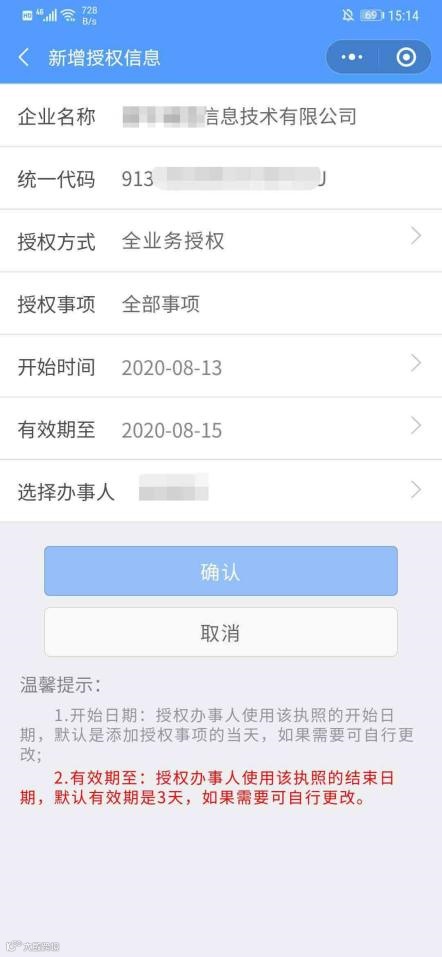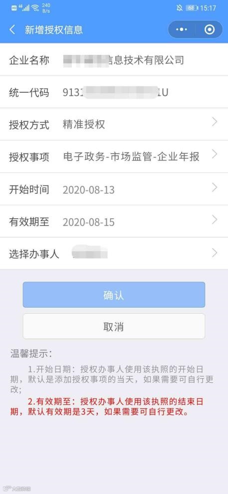 法定代表人或证照管理员录入授权信息并选择被授权的办事人(如果该办事人不在列表中,或者企业没有办事人,则需要添加),授权信息保存成功后,办事人可以去下载相应的执照,还未生效的授权执照可以下载,但不可使用。