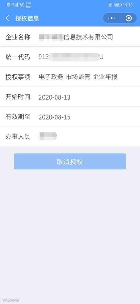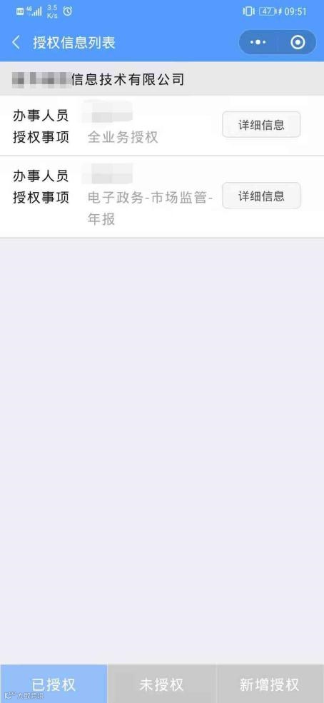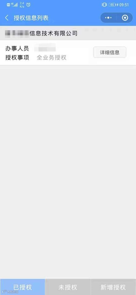 在授权信息列表点击某一授权事项是“详细信息”可以查看该授权事项的详细信息,也可进行取消授权操作。授权被取消后办事人下载的该执照将被失效。