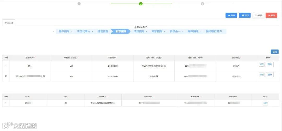 法定代表人录入证照管理员的相关信息。信息保存成功后,该证照管理员可以去下载执照并使用。如果该公司已有五个证照管理员,则不允许添加。如果想要添加新的证照管理员,需要删除已添加的证照管理员。
