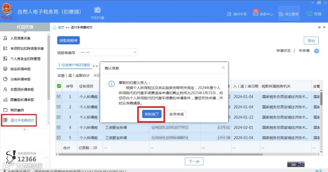 点击左侧菜单“退付手续费核对”,进入“退付手续费核对”界面,系统自动弹出确认信息提示框,点击【我知道了】,系统自动带出单户核对清册。
