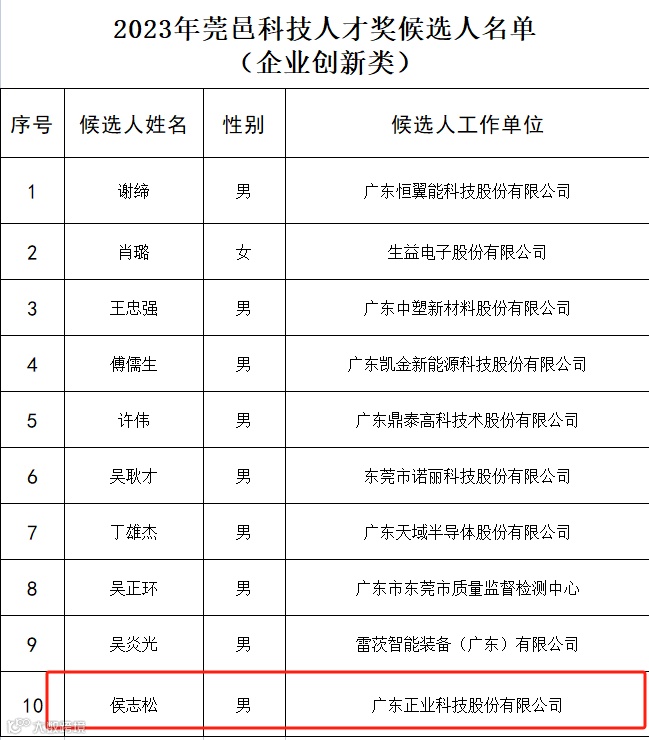 根据《2023年莞邑科技人才奖评选方案》《2023年莞邑科技人才奖评选组织工作方案》文件要求,经过形式审查、专家评审等程序,广东正业科技股份有限公司(以下简称:正业科技)仪器事业部侯志松同志荣获“莞邑科技人才奖”。