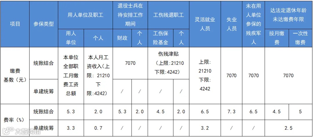 在缴费费率方面,统账结合职工基本医疗保险总费率为7.8%(含生育保险),其中用人单位基本医疗保险费率为5.0%,个人费率为2.0%,生育保险费率为0.8%;单建统筹职工基本医疗保险总费率为4.0%(含生育保险),其中用人单位基本医疗保险费率为2.5%,个人费率为0.7%,生育保险费率为0.8%。2024年4月1日至2025年12月31日阶段性降低统账结合职工基本医疗保险用人单位、参保人(不含达到法定退休年龄一次性缴费人员)缴费费率0.5个百分点,详见下图:
