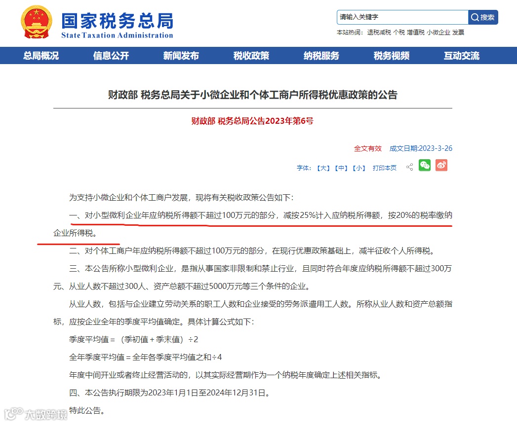 小型微利企业:对小型微利企业年应纳税所得额不超过100万元的部分,减按25%计入应纳税所得额,按20%税率缴纳企业所得税(财政部 税务总局公告2023年第6号)
