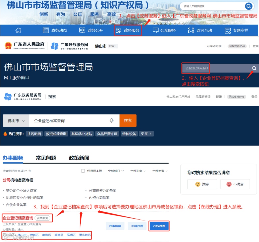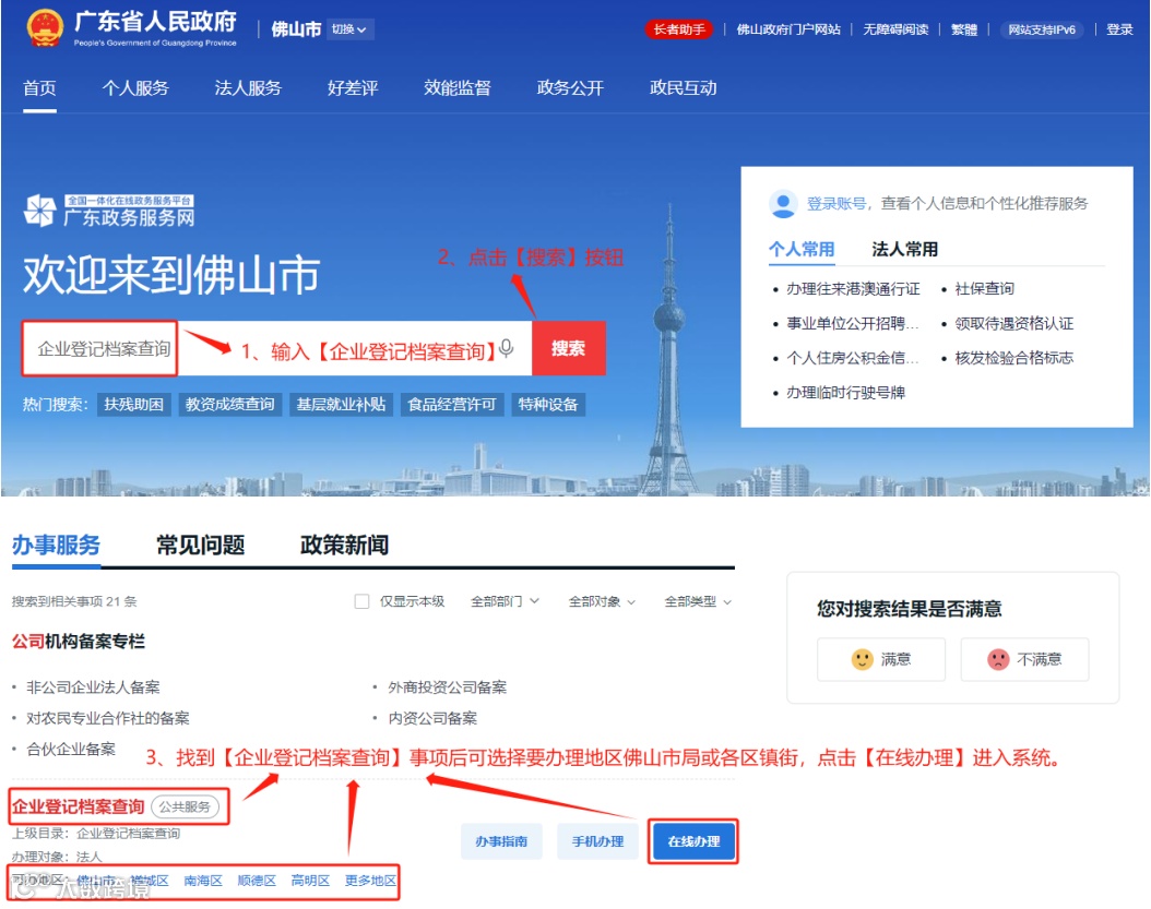 (1)登录“广东省政务服务网”https://www.gdzwfw.gov.cn/,在搜索栏输入“企业登记档案查询”搜索,找到“佛山市及各区”再选择市场主体登记机关所在的市场监管部门在线办理。