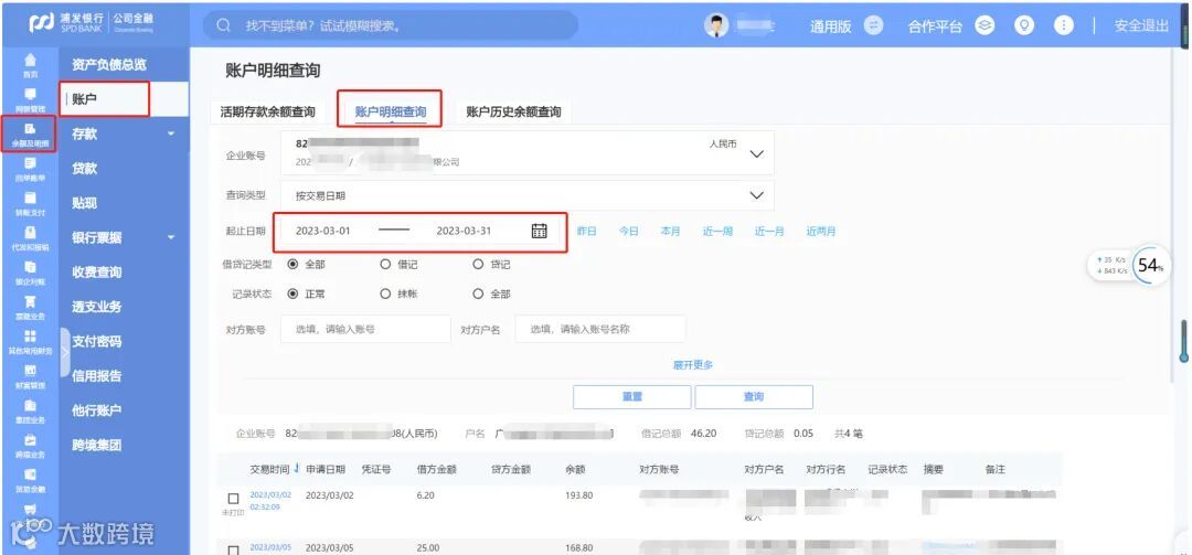 登录网银-余额及明细-账户-账户明细查询-起止日期(当月第一天到最后一天,如2023.4.1-2023.4.30)-查询-全选-excel下载