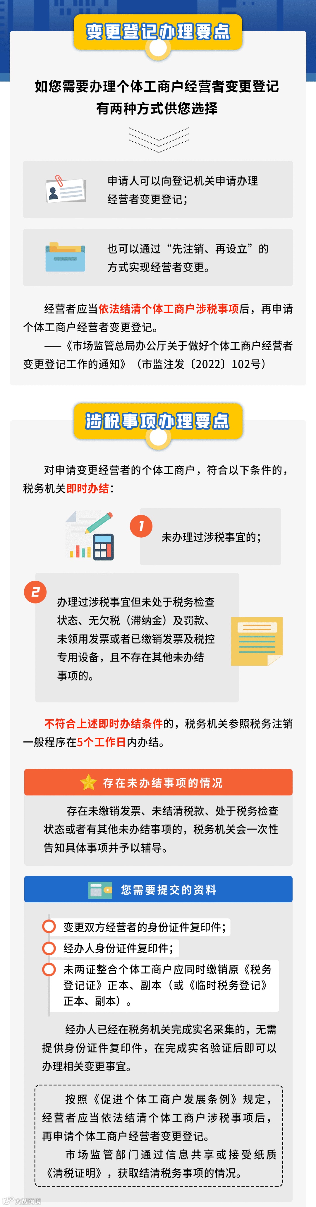 1、已办理过信息确认的个体工商户申请变更经营者的,纳税人应结清依法应缴纳的税款,不存在税务未办结事项。