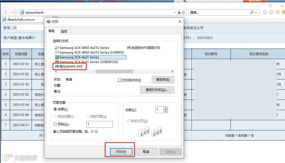 导出流水路径:账户管理 → 账户明细查询 → 选择"交易账号“ → 选择日期 → 查询 → 点击”打印明细“ → 选择”导出为WPS PDF“(或者其他PDF选项) → 点击“打印”