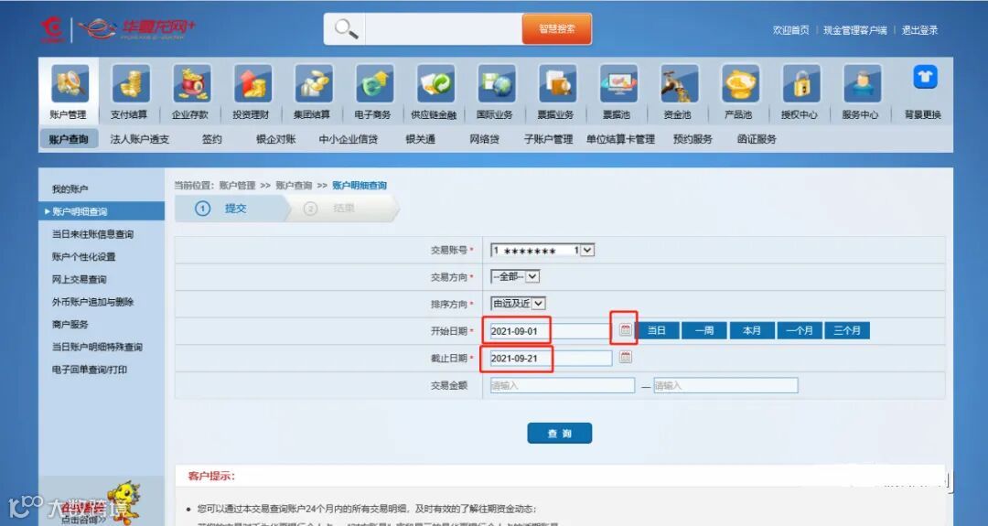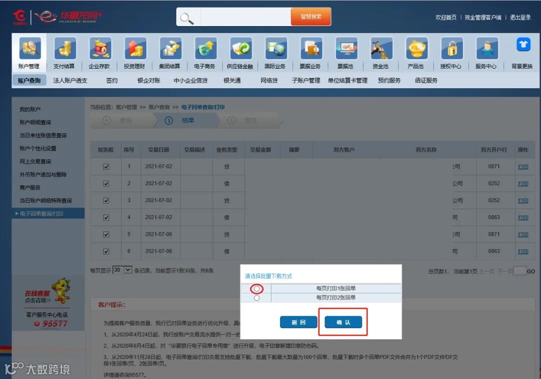 路径:账户管理 → 电子回单查询打印 → 选择交易账户 → 选择日期 → 查询 → 全选 → 批量下载 → 选择“每张打印1张回单” → 在下方跳出对话框选择“保存” → 输入文件名“**公司回单” → 保存到电脑