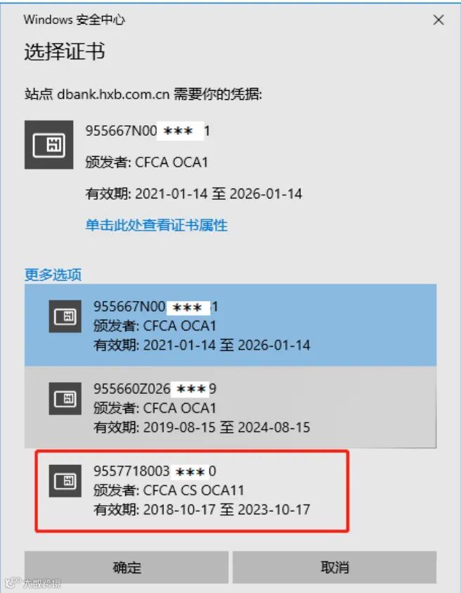 一、登录:点击“更多选项”,选择和U盾背面数字相同的证书。
