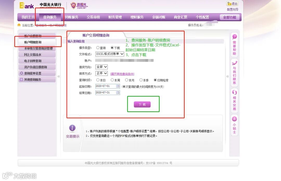 登录》首页》查询服务》账户明细查询》选择文件格式Excel》起始日期(一般按月导出,当月第一天到最后一天。例如2023.4.1-2023.4-30)