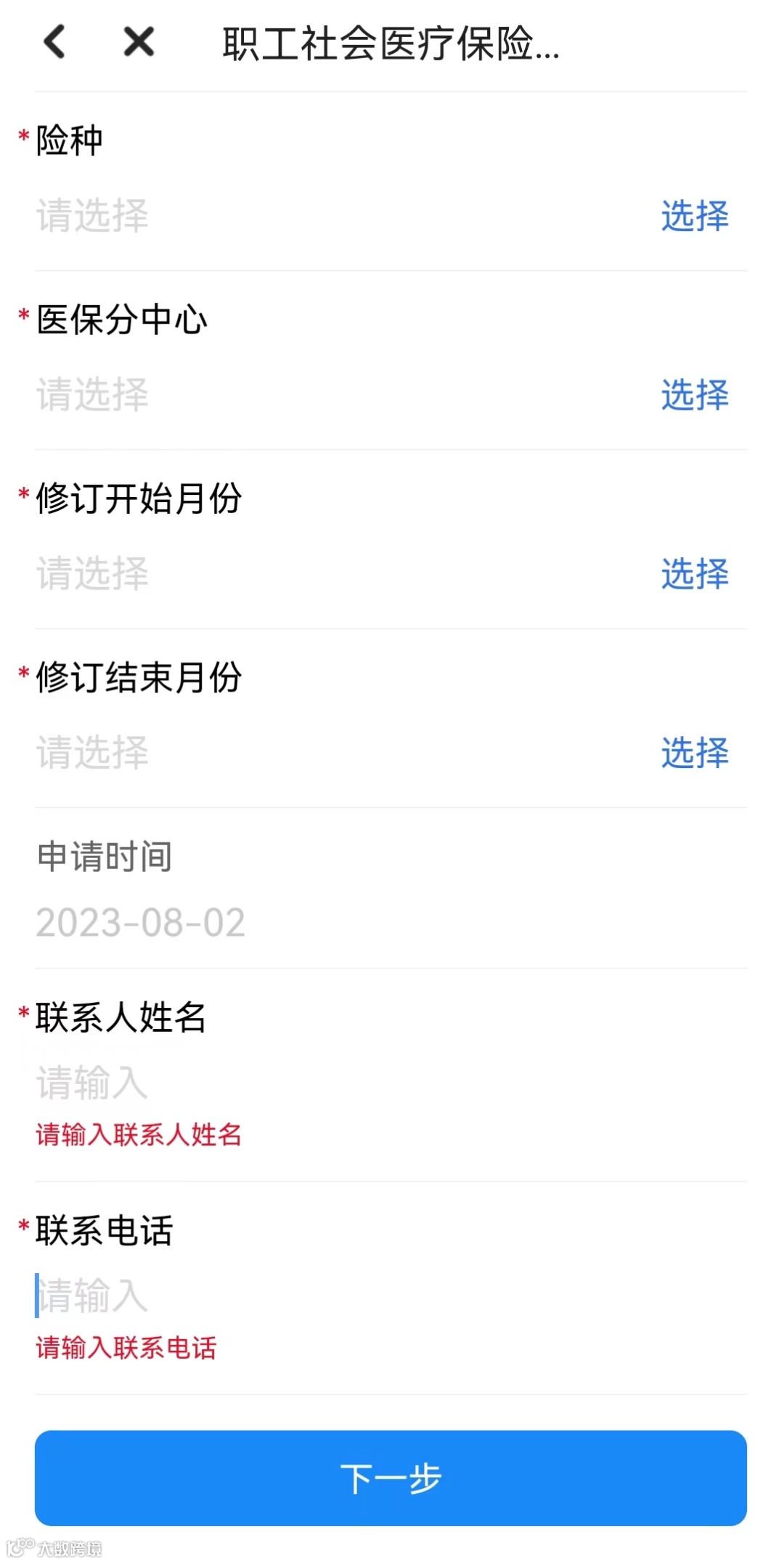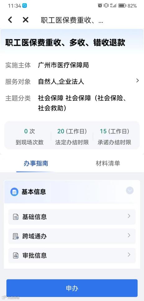 2.进入业务界面,点击“申办”,按提示填好相关信息,并按参保所属区选择对应的医保分中心(无需现场办理或者递送相关材料),点击“下一步”。
