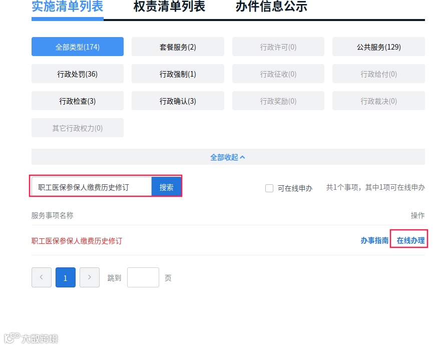 3.在搜索栏搜索“职工医保参保人缴费历史修订”,点击“在线办理”。