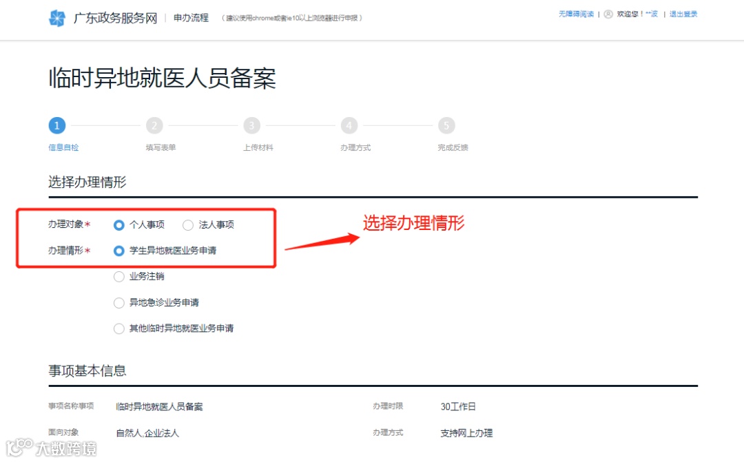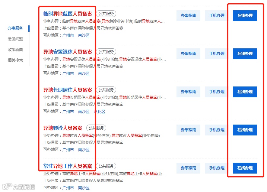 4. 办事站点选择“广州市”(请勿选择至区),并根据不同的情形选择具体业务,点击“在线办理”。