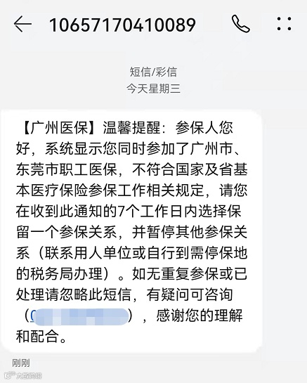 这是广州医保向重复参保人员发送的提醒。因你在省内多地/多险种参保缴费形成了重复参保,根据国家、省关于基本医疗保险参保管理政策,各地要进行有序清理,在保留一个参保关系的同时,应及时终止重复的参保关系。因此,重复参保的人员,仅可选择保留1个有效参保关系,请您在收到短信7个工作日内暂停其他参保关系。