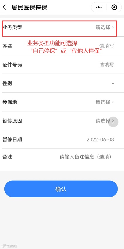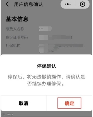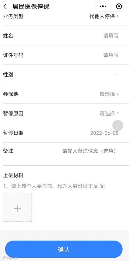 选择“业务类型”(可选择“自己停保”或“代他人停保”),填写好个人信息、参保地及暂停原因,上传材料(自己办理停保无需提交材料)后点击确认,待通过审核后即可停保。