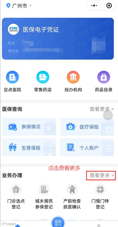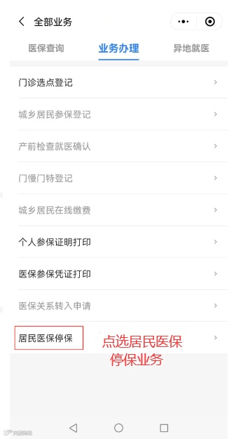 点选【业务办理】--【查看更多】,选择进入【全部业务】界面,选择【居民医保停保】功能。