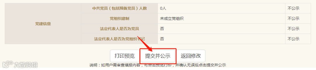 填报完成后可预览填报内容,填报人员对填报的内容可以进行最后一次检查,若信息无误,则点击【提交并公示】即可完成年报公示工作。若有错误需要进行修改,则点击【返回修改】。