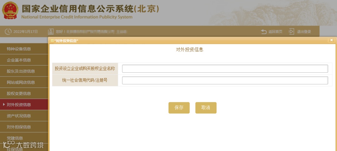 10、填写对外投资信息。点击左边的“对外投资信息”,之后再根据实际情况点击“添加”填写相关信息,填写完成后完点击“保存”。如无对外投资情况的更的则无需填写此项信息。