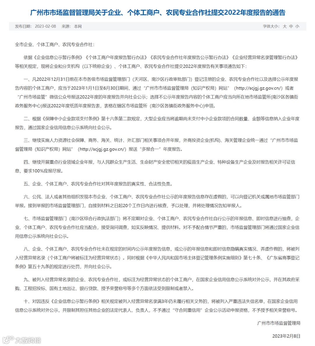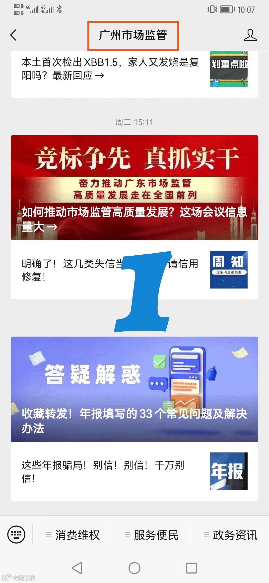 关注“广州市场监管”微信公众号→“服务便民”→“年度报告”。