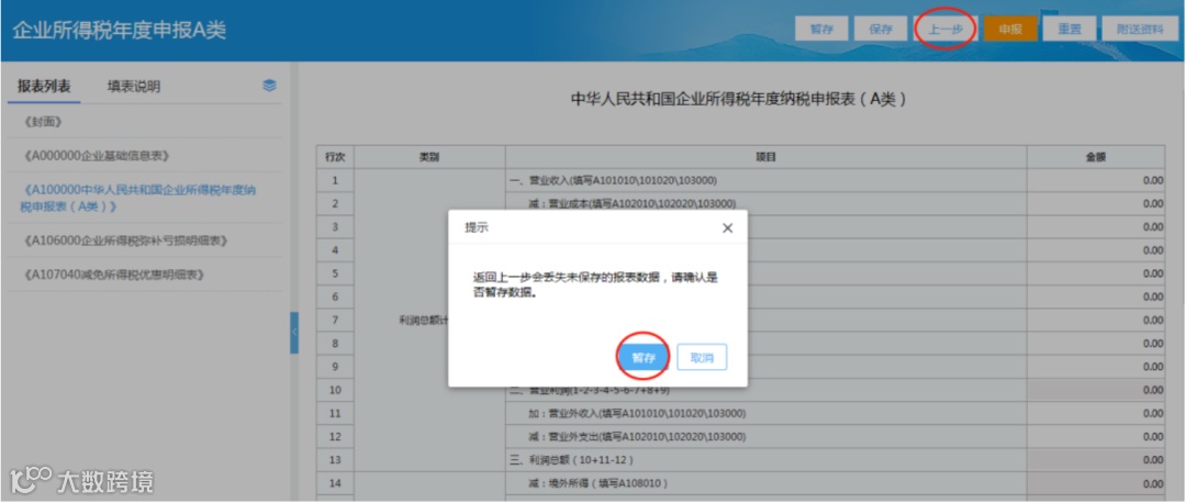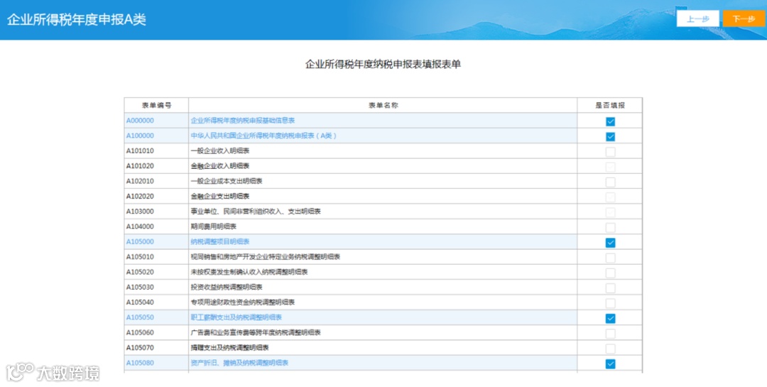 填报过程中若发现少勾选或多勾选表单,可点击【上一步】,选择是否暂存数据后返回“企业所得税年度纳税申报表填报表单”界面,进行重新勾选表单。