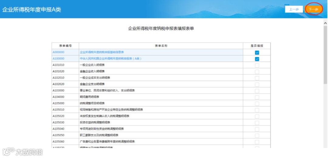 进入“企业所得税年度纳税申报表填报表单”界面,选择填报表单后,点击【下一步】。