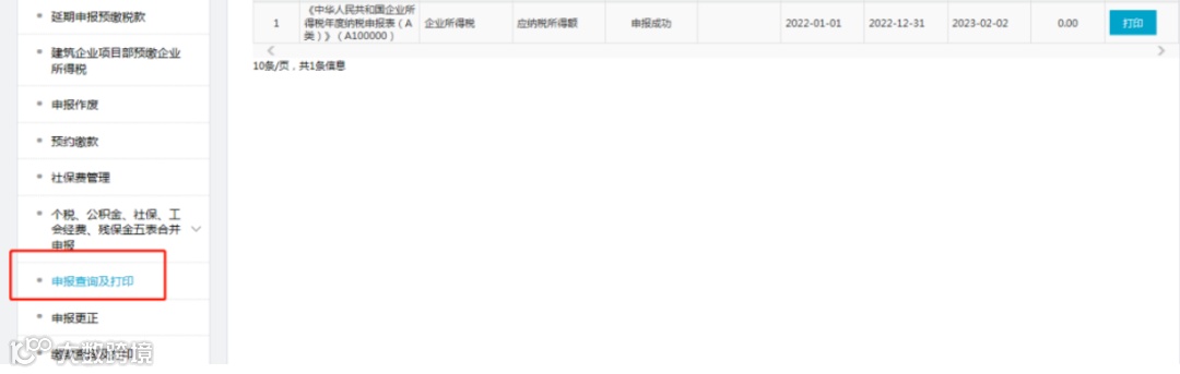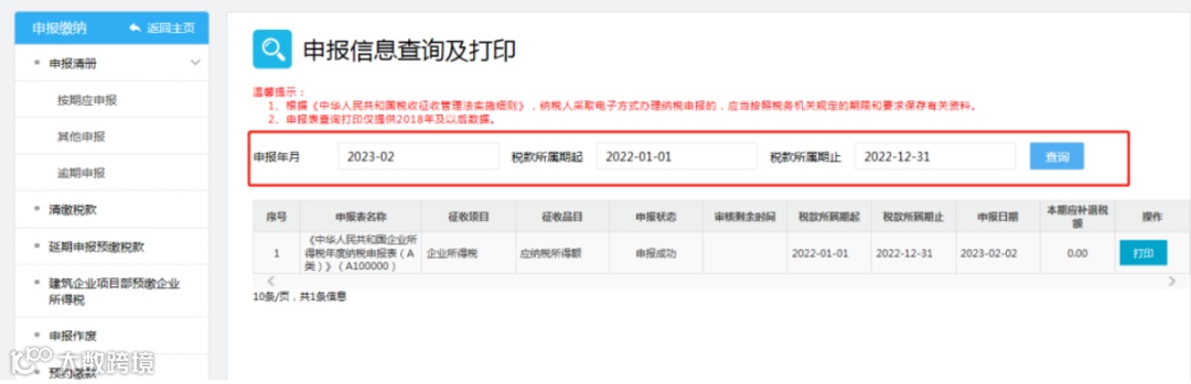点击【我要办税】-【税费申报及缴纳】-【申报查询及打印】输入申报所属期起止时间,点击【查询】,可进行申报表打印。