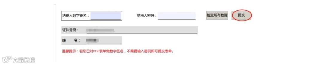 将PDF文件滚动至最后,检查所有数据,确认申报数据是否符合校验规则后输入纳税人密码(为电子税务局当前用户的登录密码),点击【提交】完成申报。