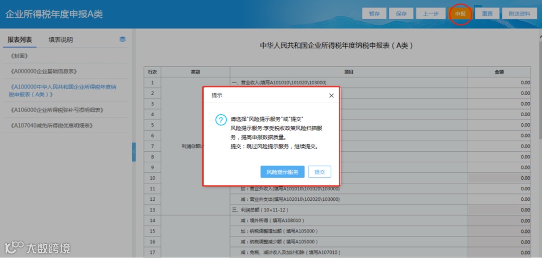 填写完毕后点击【申报】,弹出“风险提示服务”界面,点击“确定”对申报数据进行质量审核,并根据审核疑点内容进行报表数据调整。
