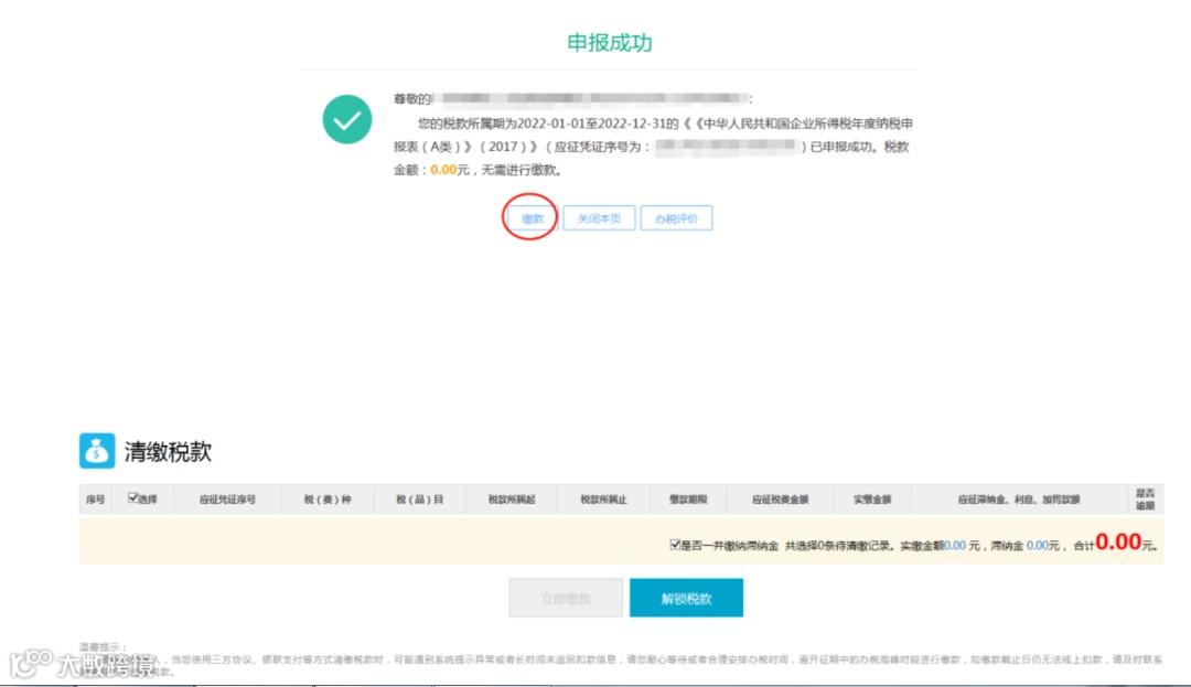 申报成功后,系统跳转申报结果页面,如产生税款,可点击【缴款】,进入清缴税款界面。