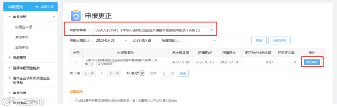 点击【我要办税】-【税费申报及缴纳】-【申报更正】选择申报表种类,点击【查询】,就可以更正申报啦。