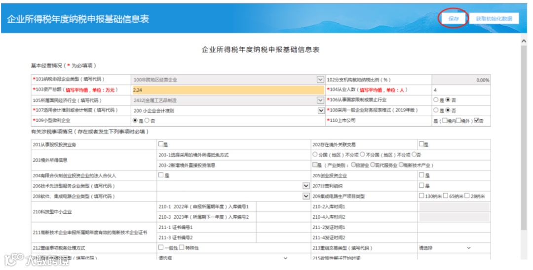 进入“企业所得税年度纳税申报基础信息表”,填写必填数据,点击【保存】。
