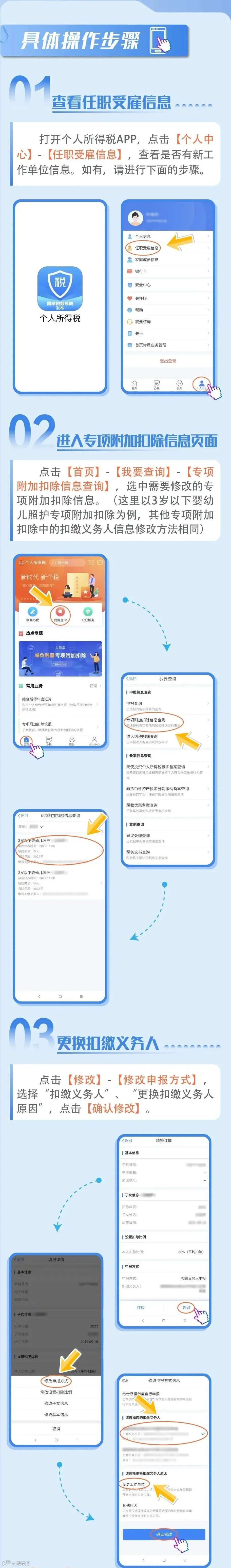 兔年伊始,随着各行各业加快推进复工复产,一些企业开始加大招聘力度,一些求职者也在年初选择跳槽换工作。小编提醒,入职新单位后,请记得更改个人所得税专项附加扣除中的扣缴义务人信息,以便及时享受个税专项附加扣除。具体如何操作?下拉查看步骤。