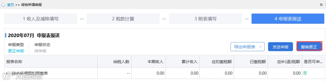 如果在报送申报表之前,发现原申报数据无误,可点击【撤销更正】按钮,撤销更正申报。但成功报送申报表后,无法撤销更正。如需要使用原申报数据,可查看系统自动导出备份的原申报记录。