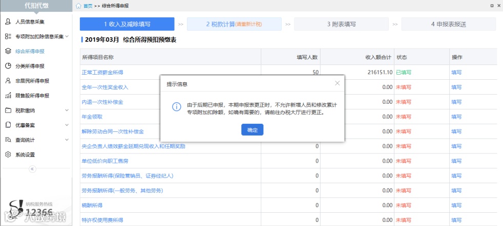 1.点击【1收入及减除填写】,系统提示往期错误更正,不能新增人员和修改累计专项附加扣除额。选择需要修改的所得项目。
