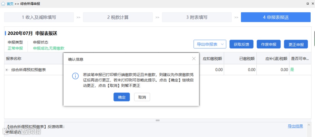 3.点击【更正申报】按钮,启动更正申报,系统提示往期错误更正申报成功后,需要对后续税款所属期的综合所得预扣预缴申报表进行逐月更正。