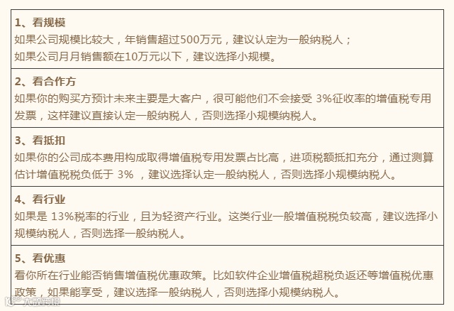 如果你的公司成本费用构成取得增值税专用发票占比高,进项税额抵扣充分,通过测算估计增值税税负低于3% ,建议选择认定一般纳税人,否则选择小规模纳税人。