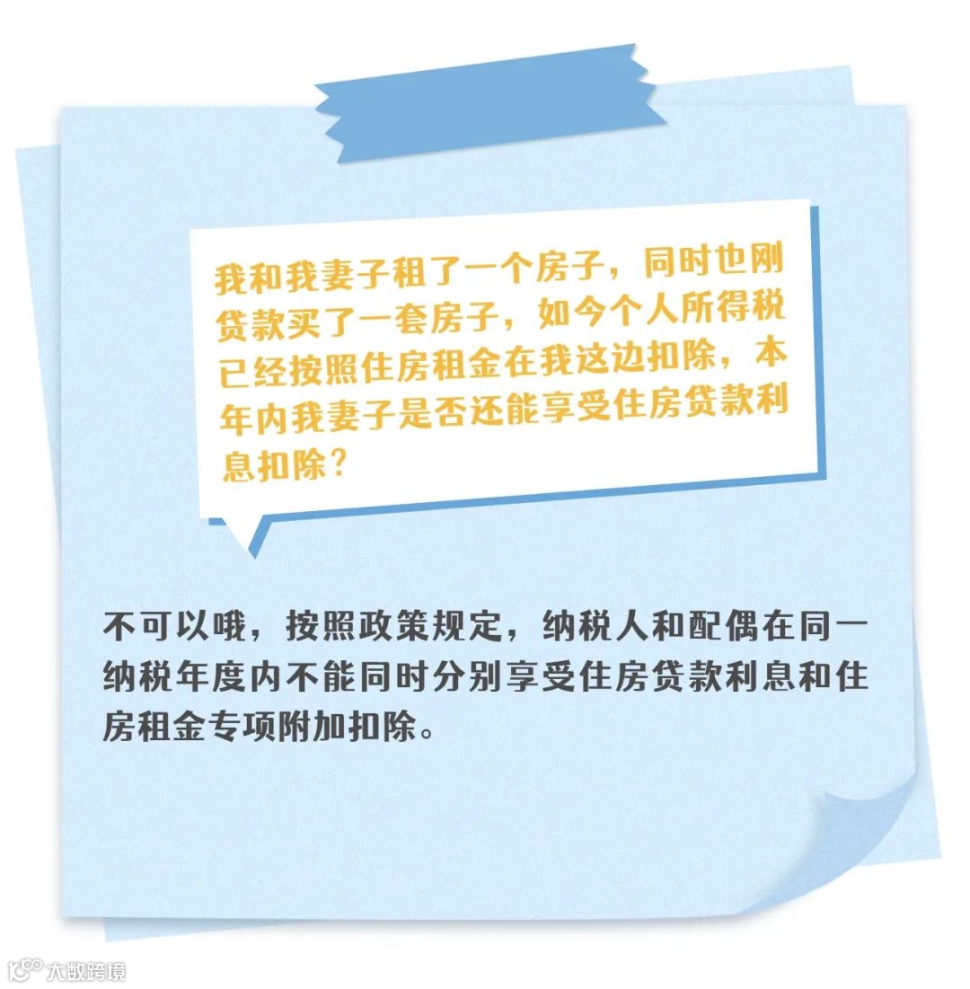 2. 您以及您的配偶在同一纳税年度内,不能同时分别享受住房贷款利息和住房租金专项附加扣除。