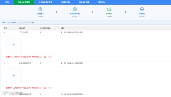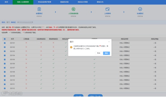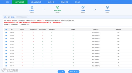 第三步:系统通过联网数据对残疾人的就业情况进行认证,如果所有数据自动核验通过,且对核验结果无异议,点击下一步继续操作(跳转至操作手册第六步),如果存在部分数据未通过,可以勾选上本单位认为符合情况的月份。提交相关材料,交由残联进行人工审核。