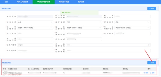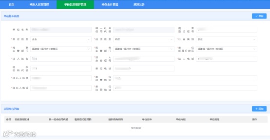 在单位信息维护管理中,可点击添加或修改按钮,对本单位的关联单位(或劳务派遣单位)进行维护。