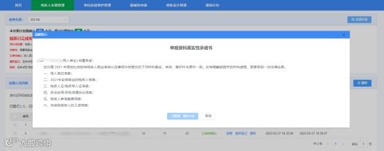 第七步:如果对审核结果无异议,可以点击 “完成申报”按钮。根据页面提示,阅读承诺书,并点击“已阅读,确认”完成年审认证,完成确认后将不能进行残疾人添加、修改、删除等操作。