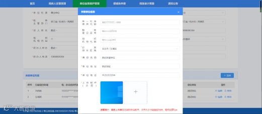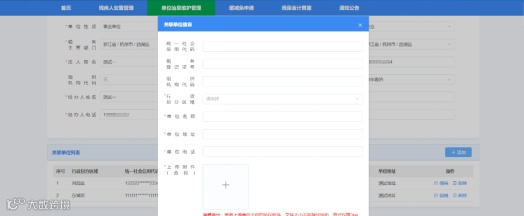 第一步:用户点击添加按钮,弹出新增单位信息弹窗,可根据页面提示信息,正确填写新增单位信息,上传合同附件,点击保存,新增单位信息。