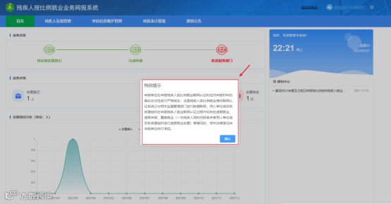 4、进入系统页面后,提示“申报单位在申报残疾人按比例就业联网认证时应对申报材料的真实合法性进行严格核实,全国残疾人按比例就业情况联网认证系统已与相关监督管理部门进行数据联网,用人单位或劳务派遣组织在申报残疾人就业联网认证过程中如存在虚假就业、虚假申报、重复就业(一名残疾人同时间段被多家用人单位或劳务派遣组织进行虚假就业安置)等情况的,相关法律责任由申报单位自行承担。”,请仔细阅读后办理。
