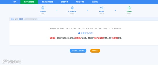 第四步:如果希望继续安置残疾人,则点击继续登记按钮。如果安置完成,则点击返回安置登记管理,回到功能首页面。