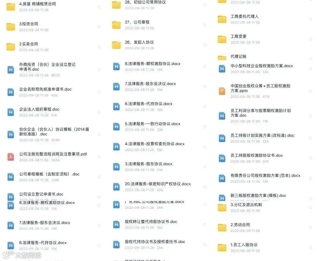 1、72套股权分配方案、62套股权代持方案、55套股权激励方案、39套员工入户方案、40套学习股权转让方案…