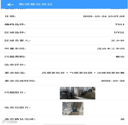 班组、区域排行榜,红、黄、绿预警一目了然。“清扫数据每天自动汇总,管理者打开手机就能查看,比翻纸质记录快得多。” “短短20多天内,完成1400多条问题整改。员工参与积极性很高。”项目负责人介绍。