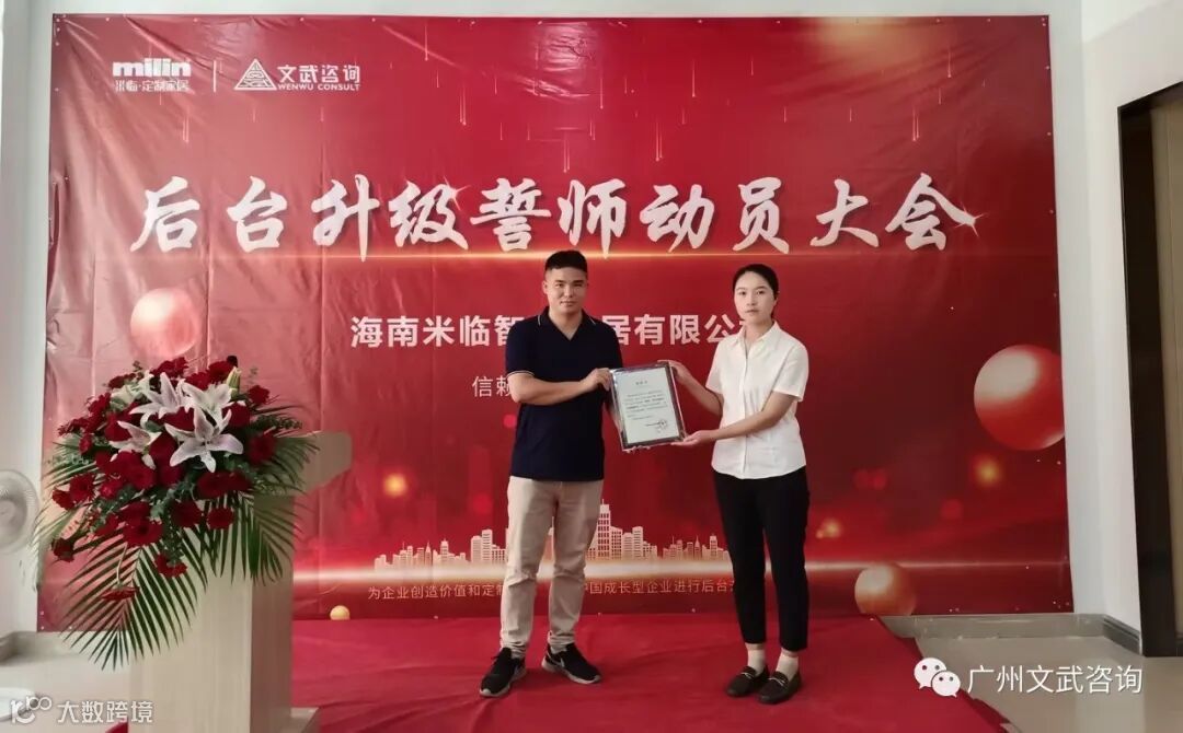 项目的实施需要企业的支持,需要米临家居团队的配合。大会上,米临家居江总向文武项目组程老师颁发授权书,并宣读后台升级领导小组名单。