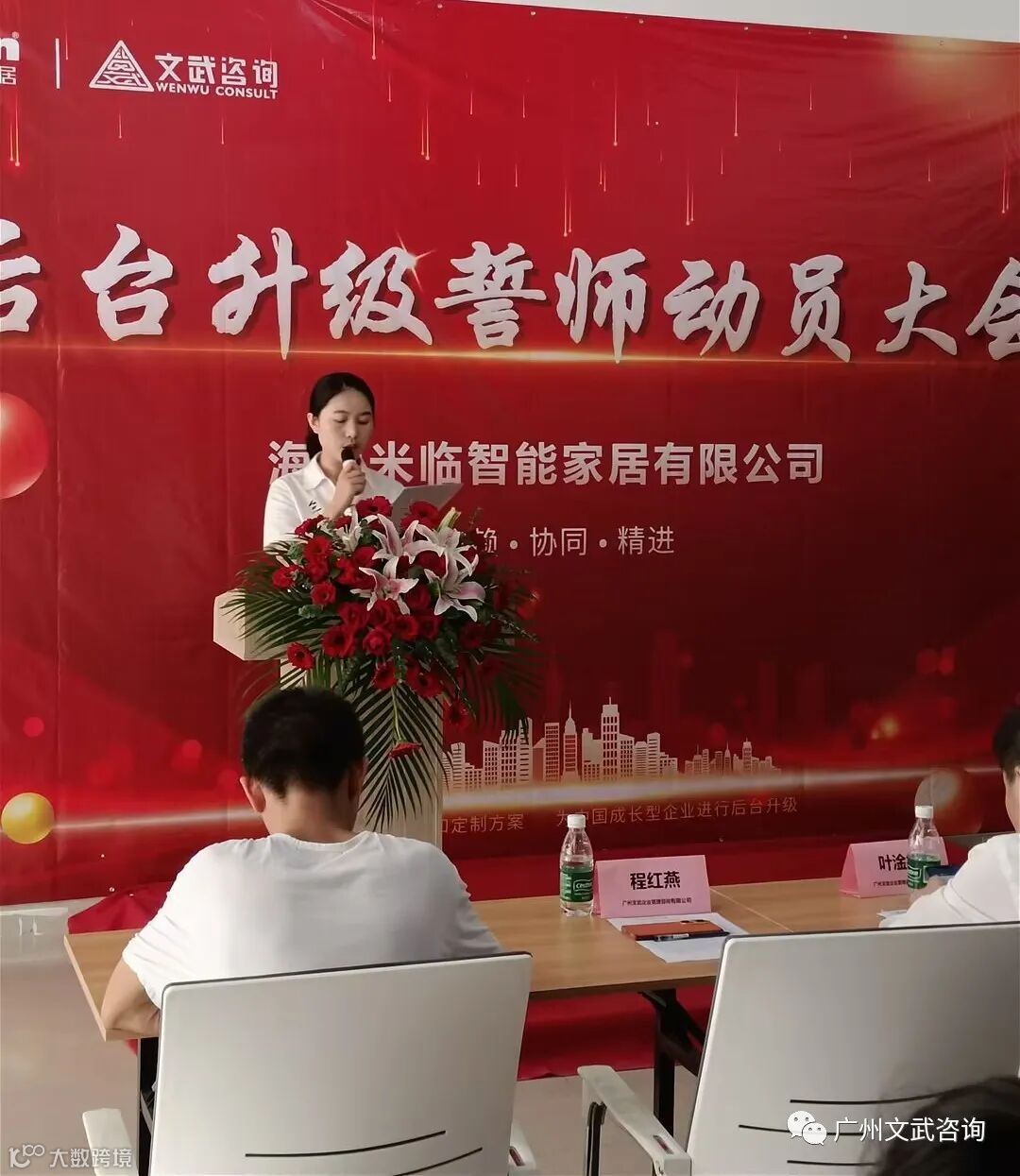 随后,文武咨询驻米临家居项目组长程老师上台发表了讲话,她首先感谢在调研及项目推动进行中积极配合的全体员工,强调了后台升级总体思路、目标以及后台升级与企业员工的关系。程老师还表示文武咨询老师将与米临家居家人一起奋斗,誓将后台升级进行到底!