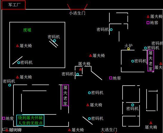 地图里有用的东西很多,如无敌房,地窖,大门等,当然密码机有10个,每次随机刷新7个,需要解密5个。密码机上有天线,如果找不到密码机可以抬头,通过天线的位置来找。