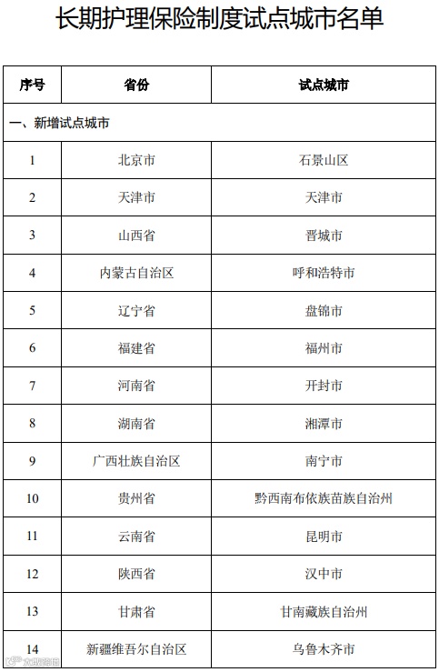根据国家医疗保障局、财政部日前发布《关于扩大长期护理保险制度试点的指导意见》,新增