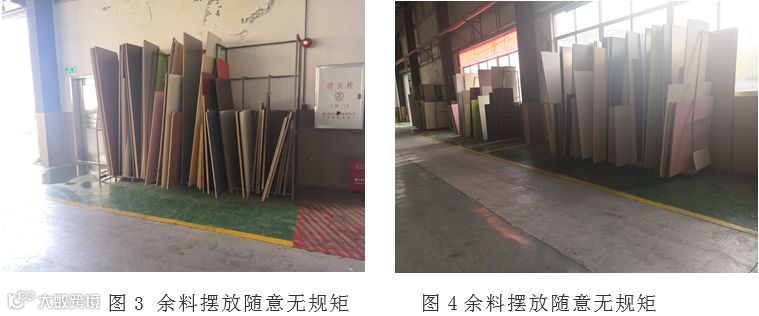 余料主要产生工序在M公司生产线上的第一道工序,根据板材优化后切割完会存在一定数量的余料,由于员工操作习性的问题以及基层管理人员管理不到位,导致余料摆放很随意,不同规格长度大小放在一起(如图3,图4),再拿余料板件来开料的时候造成查找麻烦以及抽板难等不便,严重影响员工的工作效率。从堆放的余料中采取部分需要用的料,容易出现板料倾斜侧倒的危险!